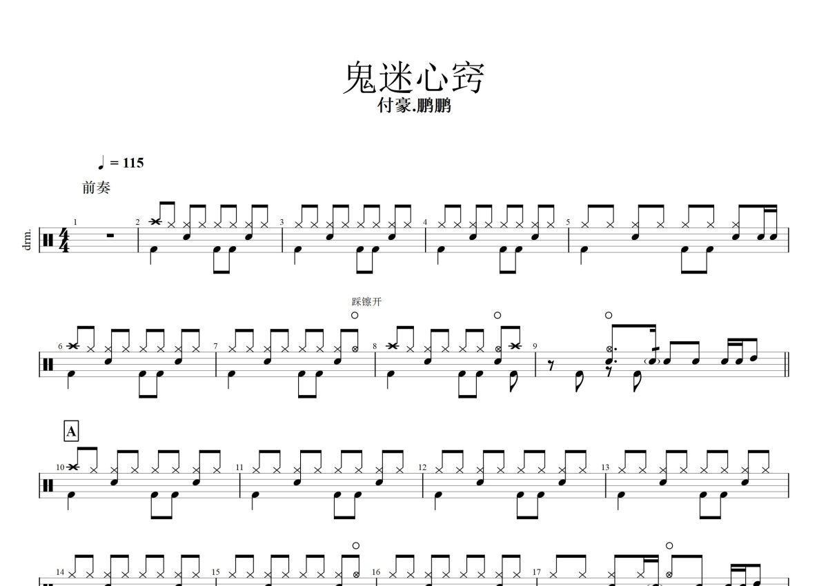 《鬼迷心窍》是付豪/鹏鹏鹏鹏音乐演唱的一首歌曲,这份鼓谱共有三张高清图谱,图谱由 @打鼓谱 编配上传,图谱使用五线谱编配,使用这份鬼迷心窍架子鼓谱,你将能够轻松地敲打出这首付豪/鹏鹏鹏鹏音乐的鬼迷心窍,快来尝试吧。鬼迷心窍 - 付豪/鹏鹏音乐 词:李宗盛 曲:李宗盛 编曲:姚雷 吉他:姚雷 贝斯:姚雷 录音贴唱/人声编辑:鹏鹏音乐 伴奏混音工程师:王嘉平 母带工程师:鹏鹏音乐。