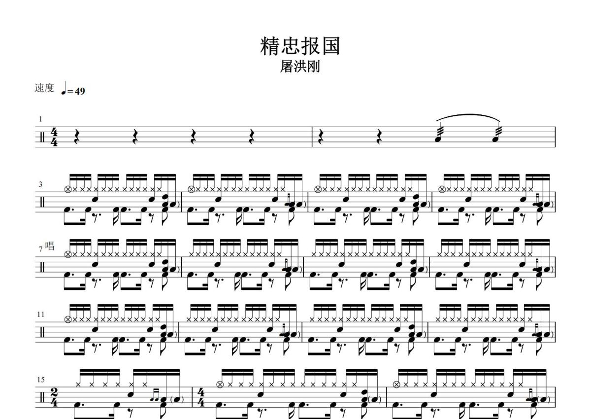《精忠报国》是屠洪刚演唱的一首歌曲,这份鼓谱共有两张高清图谱,图谱由 @打鼓谱 编配上传,图谱使用五线谱编配,使用这份精忠报国架子鼓谱,你将能够轻松地敲打出这首屠洪刚的精忠报国,快来尝试吧。《精忠报国》是屠洪刚1999年发行的一张专辑,共收录了13首歌。