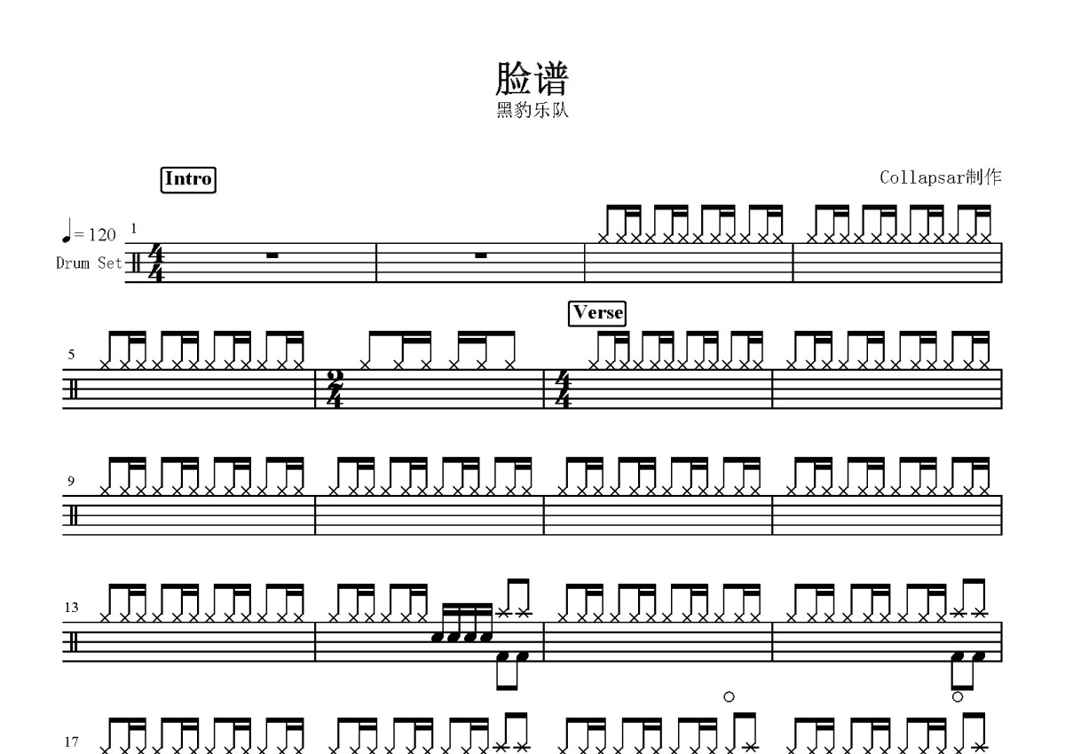 《脸谱》是黑豹乐队演唱的一首歌曲,这份鼓谱共有四张高清图谱,图谱由 @打鼓谱 编配上传,图谱使用五线谱编配,使用这份脸谱架子鼓谱,你将能够轻松地敲打出这首黑豹乐队的脸谱,快来尝试吧。《脸谱》是由中国殿堂级摇滚乐队黑豹乐队演唱的一首歌,它收录在黑豹乐队于1991年发行的专辑《黑豹1》内。