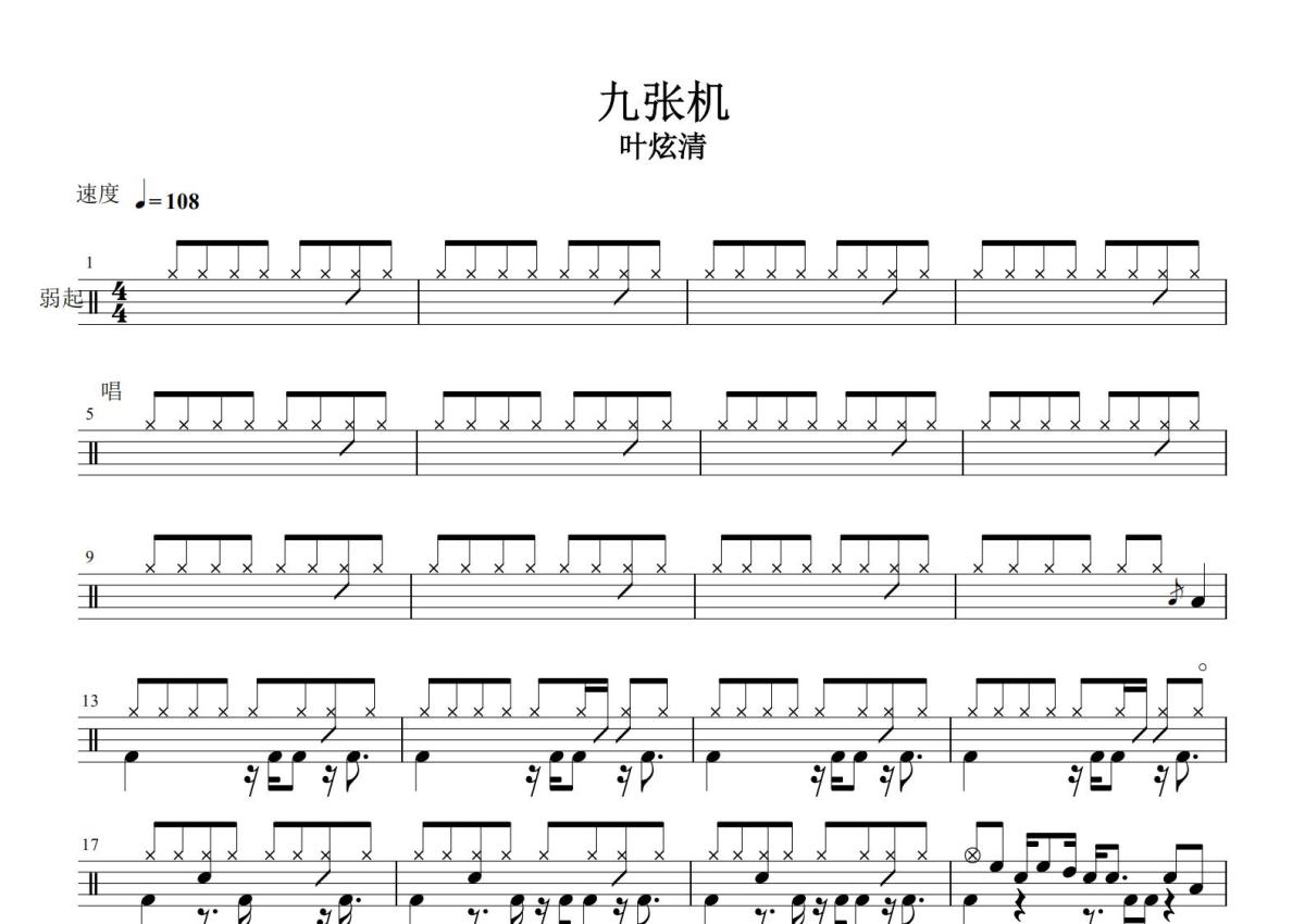 《九张机》是叶炫清演唱的一首歌曲,这份鼓谱共有两张高清图谱,图谱由 @打鼓谱 编配上传,图谱使用五线谱编配,使用这份九张机架子鼓谱,你将能够轻松地敲打出这首叶炫清的九张机,快来尝试吧。《九张机》是叶炫清演唱的歌曲,由张富贵填词、周琦谱曲,是网络剧《双世宠妃》的主题曲。