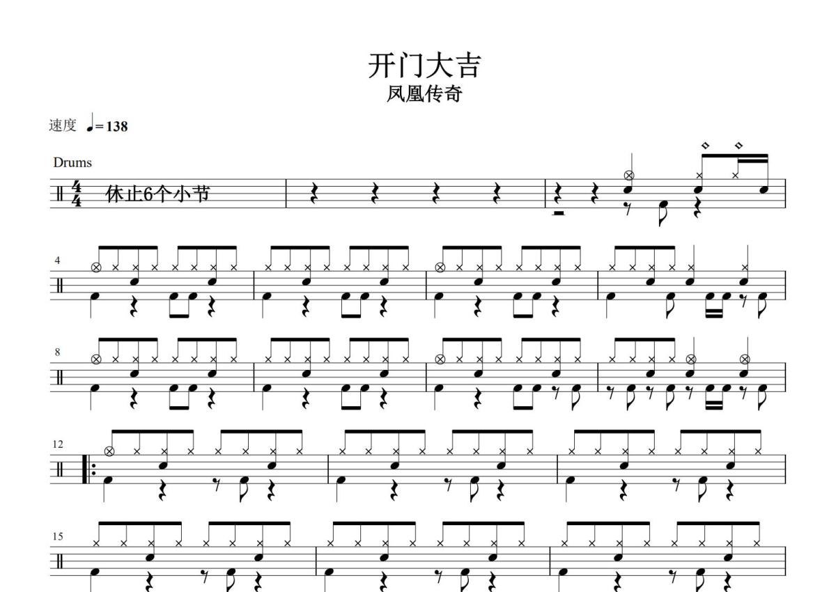 《开门大吉》是凤凰传奇演唱的一首歌曲,这份鼓谱共有三张高清图谱,图谱由 @打鼓谱 编配上传,图谱使用五线谱编配,使用这份开门大吉架子鼓谱,你将能够轻松地敲打出这首凤凰传奇的开门大吉,快来尝试吧。《开门大吉》是央视综艺频道2013全新打造的王牌节目《开门大吉》的同名主题曲,由于瑞洋作词作曲,凤凰传奇演唱。