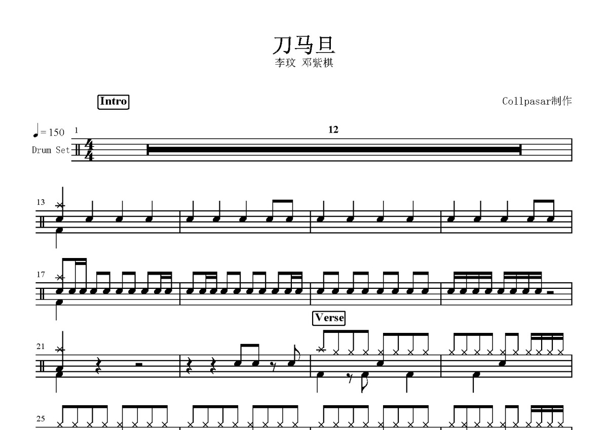 《刀马旦》是李玟/邓紫棋演唱的一首歌曲,这份鼓谱共有四张高清图谱,图谱由 @打鼓谱 编配上传,图谱使用五线谱编配,使用这份刀马旦架子鼓谱,你将能够轻松地敲打出这首李玟/邓紫棋的刀马旦,快来尝试吧。《刀马旦》李玟 邓紫棋 中国梦之声 我们的歌。