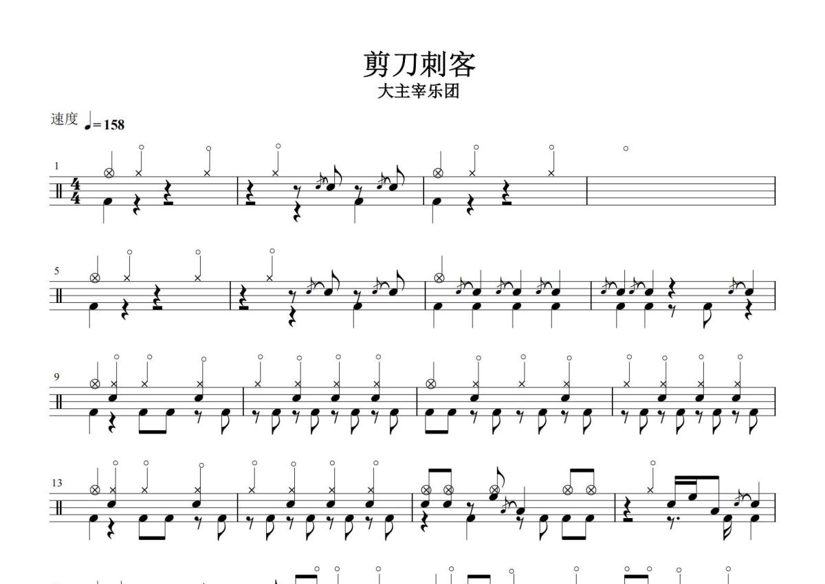《剪刀刺客》是大主宰乐团演唱的一首歌曲,这份鼓谱共有五张高清图谱,图谱由 @打鼓谱 编配上传,图谱使用五线谱编配,使用这份剪刀刺客架子鼓谱,你将能够轻松地敲打出这首大主宰乐团的剪刀刺客,快来尝试吧。《剪刀刺客》是由鲍鱼作词,侯俊杰作曲,大主宰乐团演唱的歌曲,该曲收录于大主宰乐团2018年5月10日发行的专辑《刺客伍六七 动画歌曲OST》中。该曲是动画《刺客伍六七》主题曲。