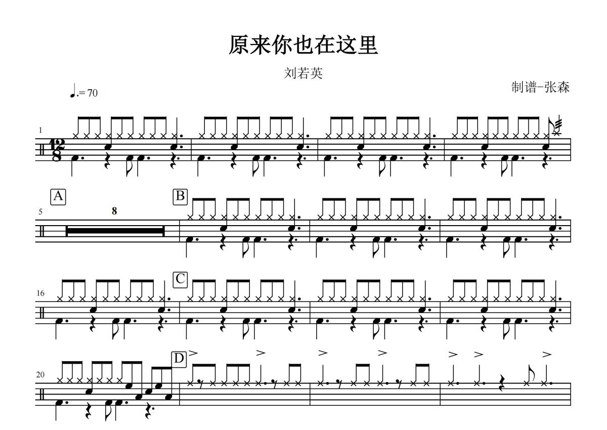 《原来你也在这里》是刘若英演唱的一首歌曲,这份鼓谱共有两张高清图谱,图谱由 @打鼓谱 编配上传,图谱使用五线谱编配,使用这份原来你也在这里架子鼓谱,你将能够轻松地敲打出这首刘若英的原来你也在这里,快来尝试吧。《原来你也在这里》是由姚谦作词,中岛美雪作曲,屠颖编曲,刘若英演唱的歌曲,收录于刘若英2003年11月21日发行的专辑《我的失败与伟大》中。该曲是电视剧《她从海上来》的主题曲。 2004年,该曲入围第二届东南劲爆音乐榜颁奖典礼港台劲爆地区十大金曲奖。