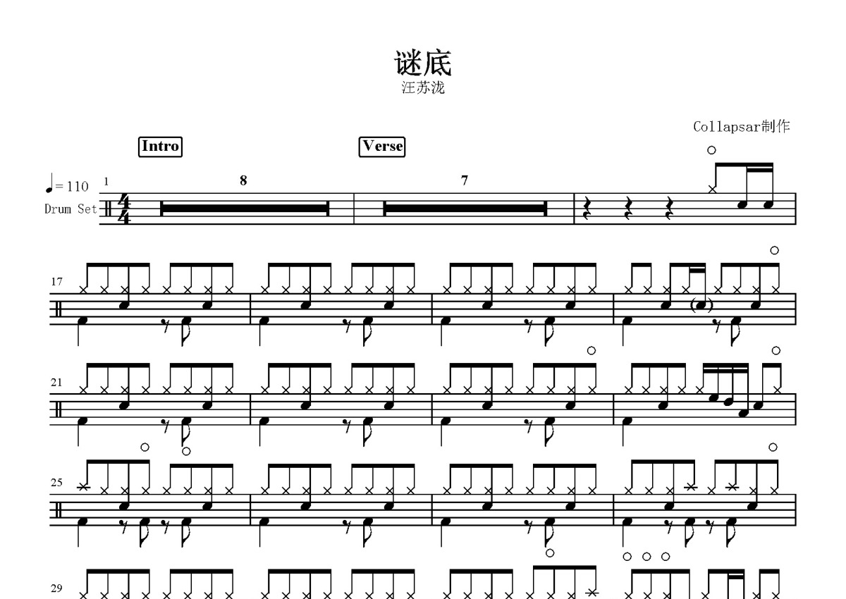 《谜底》是汪苏泷演唱的一首歌曲,这份鼓谱共有三张高清图谱,图谱由 @打鼓谱 编配上传,图谱使用五线谱编配,使用这份谜底架子鼓谱,你将能够轻松地敲打出这首汪苏泷的谜底,快来尝试吧。谜底是汪苏泷演唱的一首歌曲,收录在2014年发行《传世乐章》中。 。