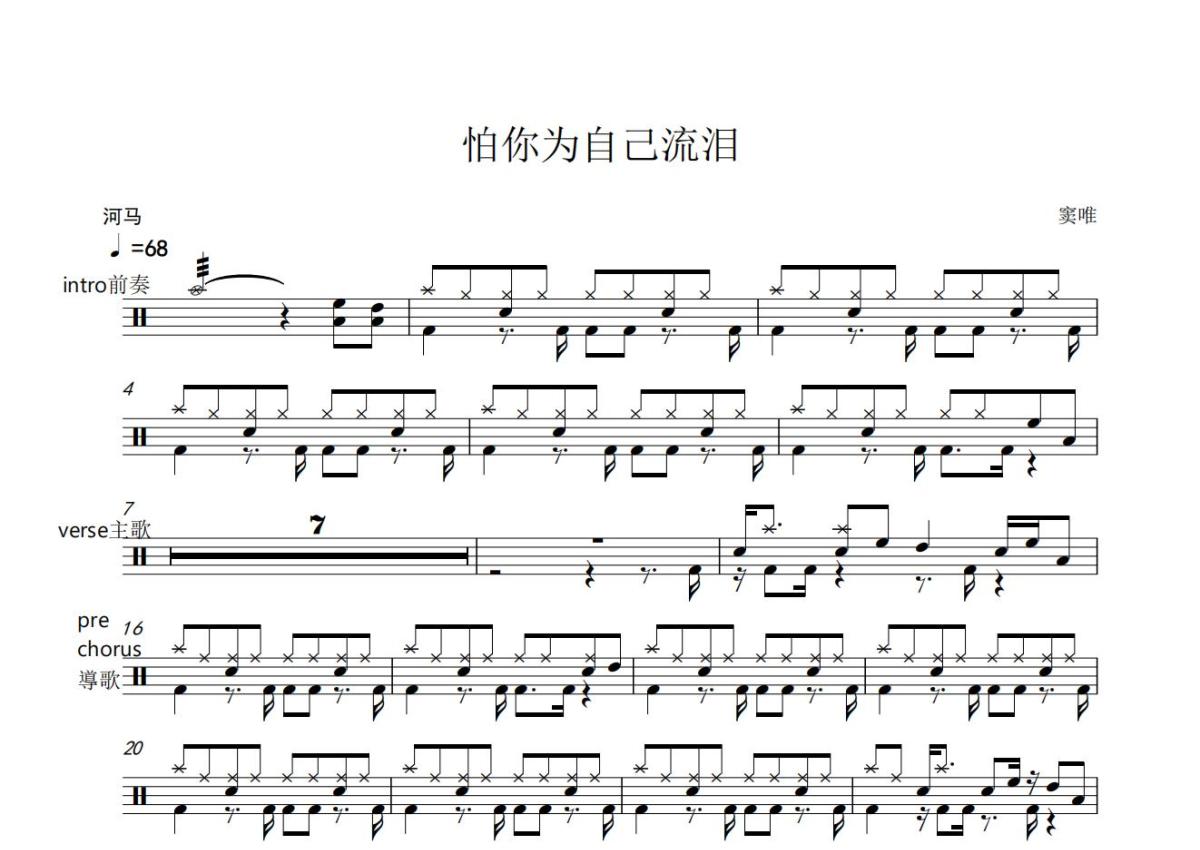 《怕你为自己流泪》是窦唯演唱的一首歌曲,这份鼓谱共有两张高清图谱,图谱由 @打鼓谱 编配上传,图谱使用五线谱编配,使用这份怕你为自己流泪架子鼓谱,你将能够轻松地敲打出这首窦唯的怕你为自己流泪,快来尝试吧。《怕你为自己流泪》是黑豹乐队演唱的一首歌曲,由窦唯作词、作曲,收录于1992年12月1日发行的专辑《黑豹》中。
