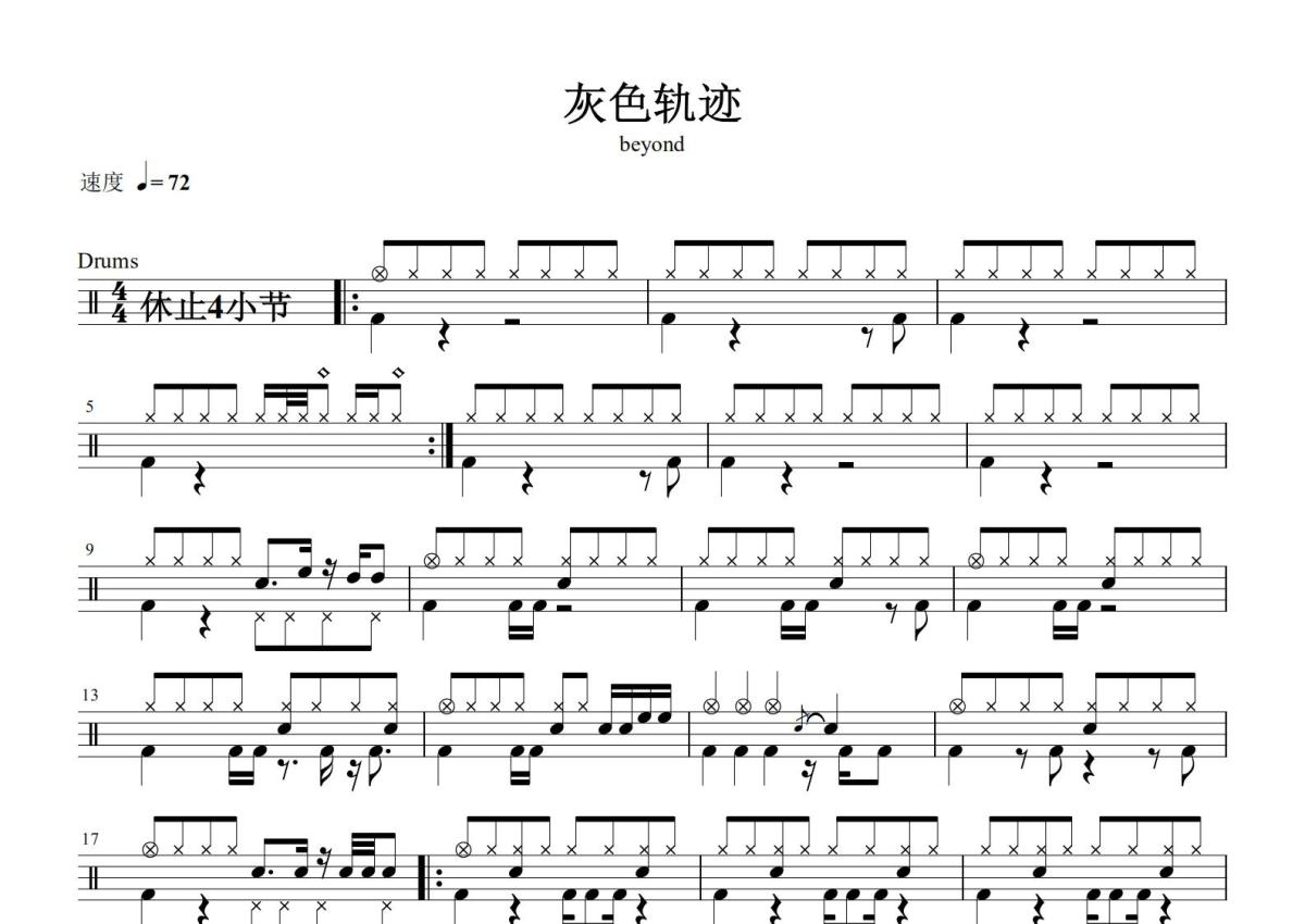 《灰色轨迹》是Beyond演唱的一首歌曲,这份鼓谱共有两张高清图谱,图谱由 @打鼓谱 编配上传,图谱使用五线谱编配,使用这份灰色轨迹架子鼓谱,你将能够轻松地敲打出这首Beyond的灰色轨迹,快来尝试吧。《灰色轨迹》是中国香港摇滚乐队Beyond的一首音乐作品(影视代表作),由刘卓辉作词,黄家驹作曲并演唱,Beyond编曲。该歌曲是1990年刘德华、吴倩莲主演的电影《天若有情》的插曲,最早收录在新艺宝唱片公司1990年6月发行的《天若有情》电影原声带中 ,后收录在Beyond1992年由新艺宝唱片公司发行的精选集《Control》中 。