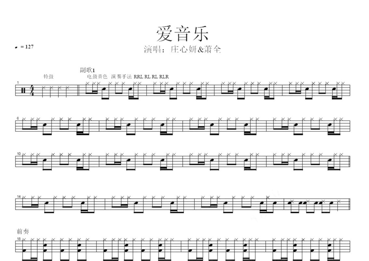 《爱音乐》是庄心妍&萧全演唱的一首歌曲,这份鼓谱共有两张高清图谱,图谱由 @打鼓谱 编配上传,图谱使用五线谱编配,使用这份爱音乐架子鼓谱,你将能够轻松地敲打出这首庄心妍&萧全的爱音乐,快来尝试吧。《爱音乐》由庄心妍和萧全合作完成,2014年4月11日首发于QQ音乐,致力音乐独家出品,该舞曲是萧全老师全程编曲制作,庄心妍参与音乐现场录制。庄心妍(Ada),1993年1月9日出生于广东省汕尾市,中国内地流行乐女歌手。萧全,1982年9月16日出生于广西壮族自治区北海市合浦县,中国内地男歌手、音乐唱作人、制作人,广东流行音乐学会会员、广东音乐家协会会员。