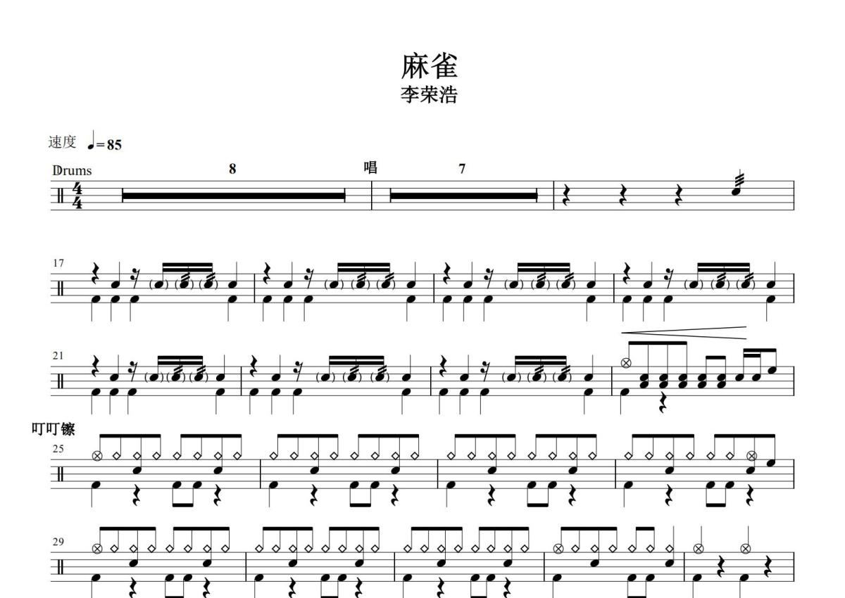 李荣浩《麻雀》鼓谱 - 架子鼓谱