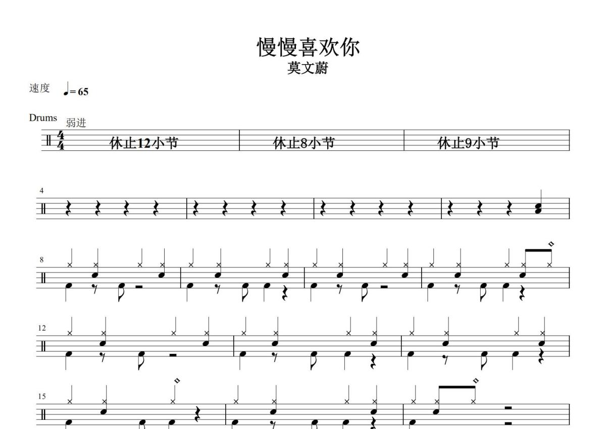 《慢慢的喜欢你》是莫文蔚演唱的一首歌曲,这份鼓谱共有一张高清图谱,图谱由 @打鼓谱 编配上传,图谱使用五线谱编配,使用这份慢慢的喜欢你架子鼓谱,你将能够轻松地敲打出这首莫文蔚的慢慢的喜欢你,快来尝试吧。《慢慢喜欢你》是莫文蔚演唱的歌曲,由李荣浩填词、谱曲,于2018年3月2日以数字单曲的形式发行 ,后收录于莫文蔚2018年5月31日发行的专辑《我们在中场相遇》中。 2018年8月29日,该歌曲获得2018华人歌曲音乐盛典年度金曲。