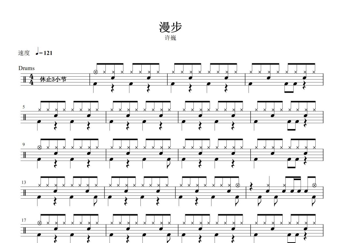 《漫步》是许巍演唱的一首歌曲,这份鼓谱共有三张高清图谱,图谱由 @打鼓谱 编配上传,图谱使用五线谱编配,使用这份漫步架子鼓谱,你将能够轻松地敲打出这首许巍的漫步,快来尝试吧。《漫步》是由许巍作词作曲并演唱的一首歌曲,该曲收录在许巍2002年发行的专辑《时光·漫步》中 。
