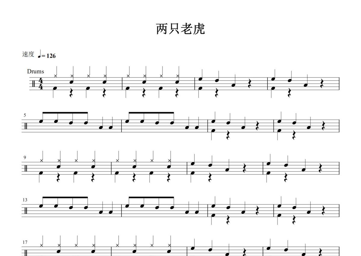 儿歌《两只老虎》鼓谱 - 架子鼓谱