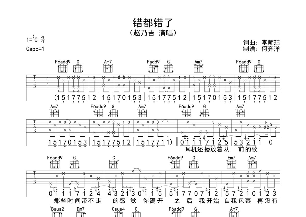 赵乃吉《错都错了》吉他谱 - C调弹唱六线谱