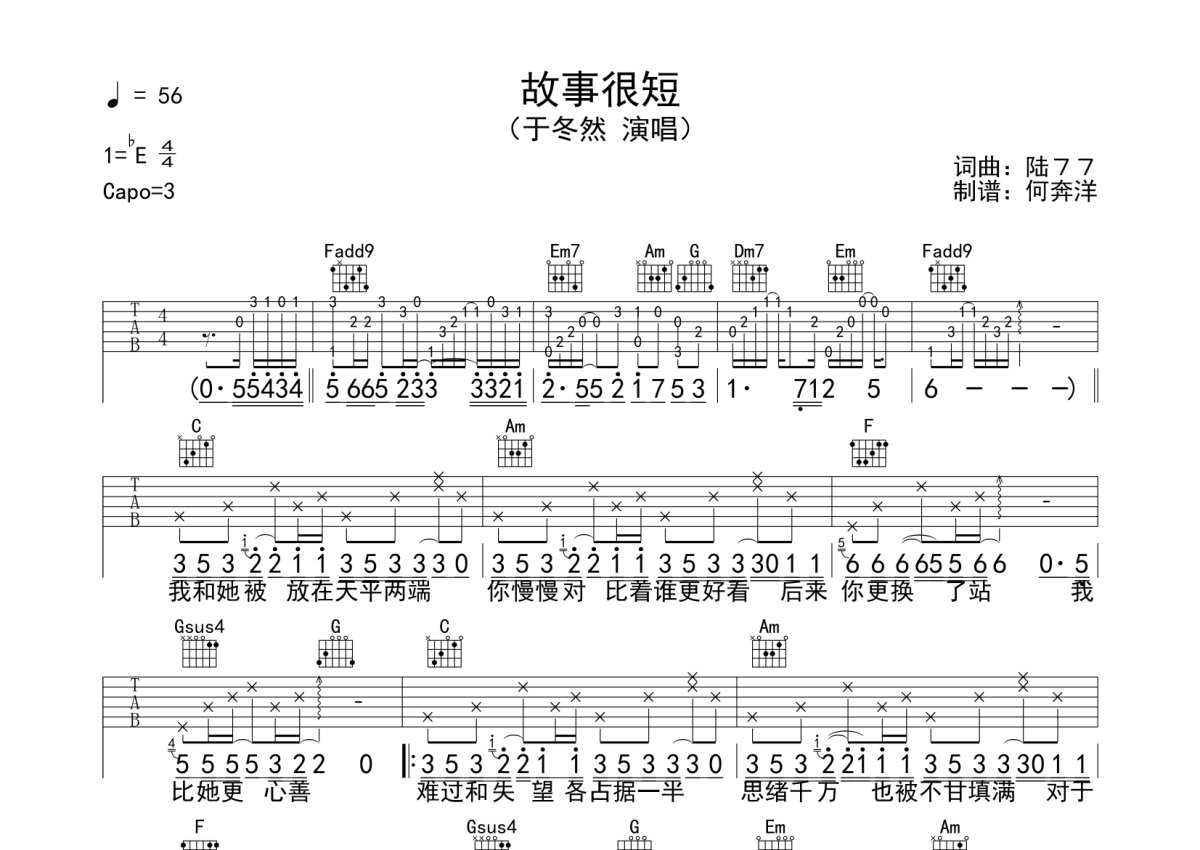 《故事很短》是于冬然演唱的一首歌曲,本吉他谱采用的是C调指法编配,这份吉他谱共有两张高清图谱,图谱由 @何奔洋 编配上传,图谱使用六线谱编配,包含吉他和弦指法、简谱以及歌词部分,使用这份故事很短吉他谱,可以让你更加方便地掌握这首歌曲的弹唱技巧,快来尝试吧。于冬然《故事很短》吉他谱_C调吉他弹唱谱。