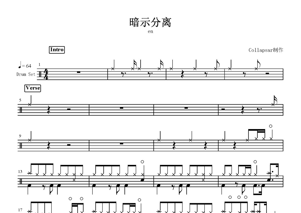 《暗示分离》是en演唱的一首歌曲,这份鼓谱共有两张高清图谱,图谱由 @打鼓谱 编配上传,图谱使用五线谱编配,使用这份暗示分离架子鼓谱,你将能够轻松地敲打出这首en的暗示分离,快来尝试吧。en演唱歌曲。