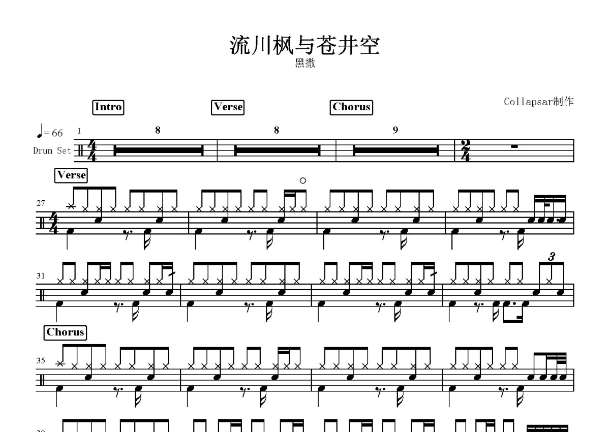 《流川枫与苍井空》是黑撒演唱的一首歌曲,这份鼓谱共有两张高清图谱,图谱由 @打鼓谱 编配上传,图谱使用五线谱编配,使用这份流川枫与苍井空架子鼓谱,你将能够轻松地敲打出这首黑撒的流川枫与苍井空,快来尝试吧。《流川枫与苍井空》是由曹石填词、填曲,黑撒乐队演唱的歌曲。