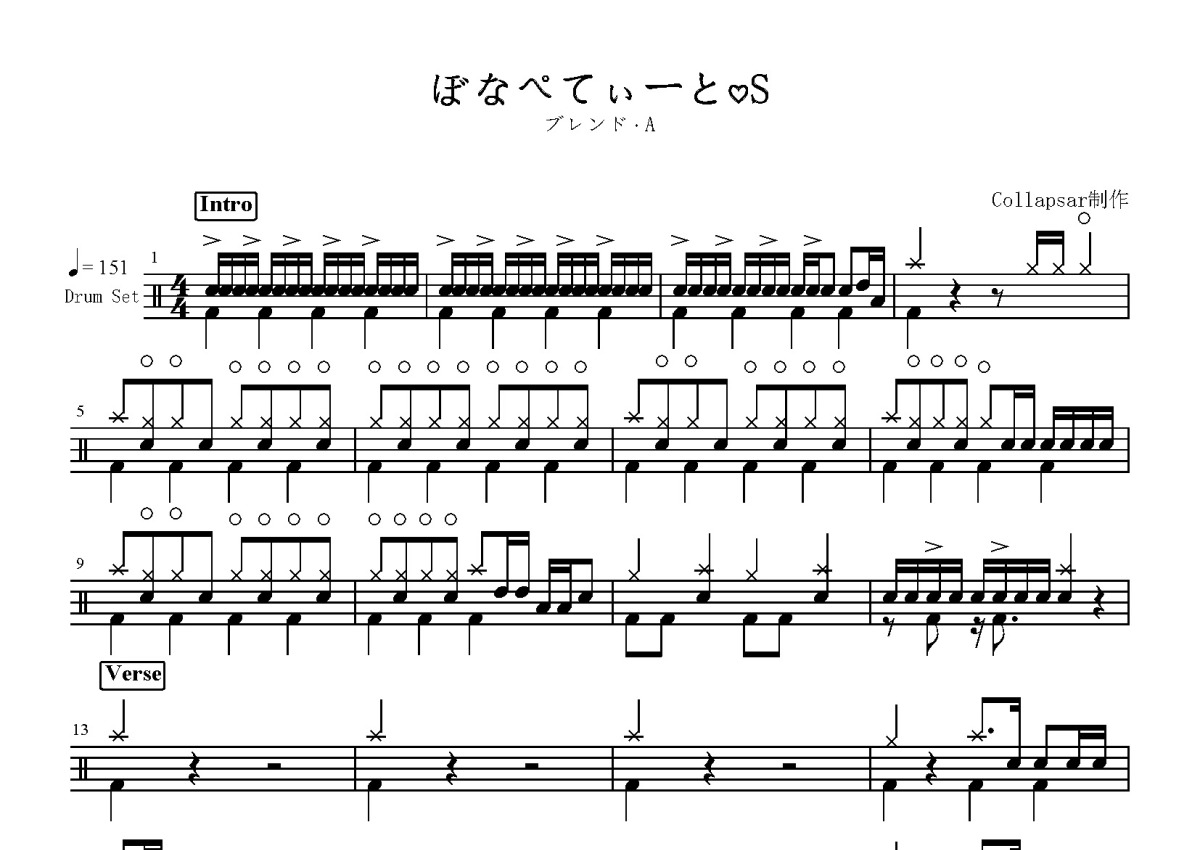 《ぼなぺてぃーと♡S》是ブレンド・A演唱的一首歌曲,这份鼓谱共有五张高清图谱,图谱由 @打鼓谱 编配上传,图谱使用五线谱编配,使用这份ぼなぺてぃーと♡S架子鼓谱,你将能够轻松地敲打出这首ブレンド・A的ぼなぺてぃーと♡S,快来尝试吧。歌曲《ぼなぺてぃーと♡S》是TV动画《调教咖啡厅》的片头曲(OP),收录于专辑《ぼなぺてぃーと♡S/デタラメなマイナスとプラスにおけるブレンド考》,由こだまさおり作词,y0c1e作曲,ブレンド・A(和气杏未、鬼头明里、春野杏)演唱,发行于2017年11月22日。