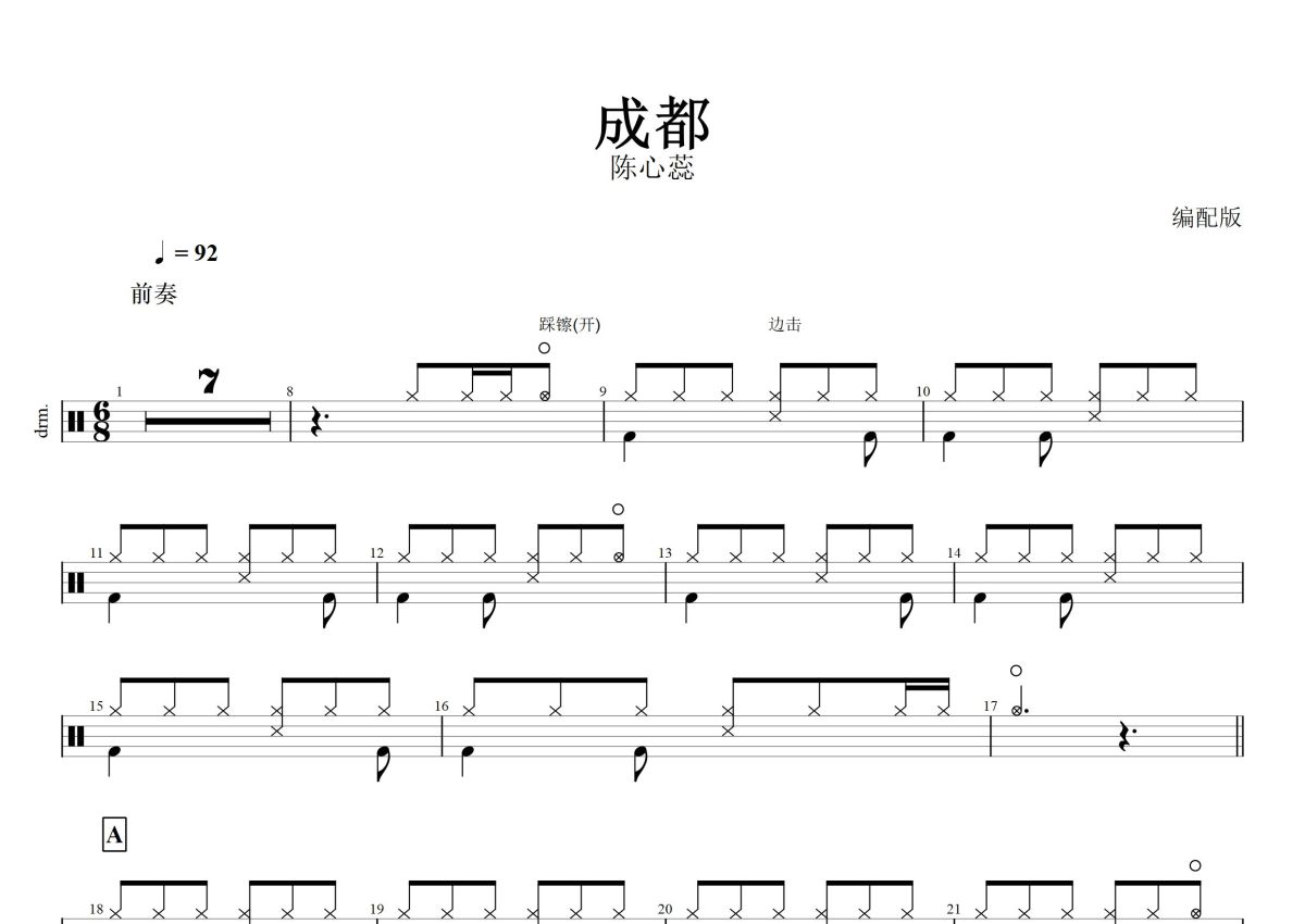 陈心蕊(编配版)《成都》鼓谱 - 架子鼓谱