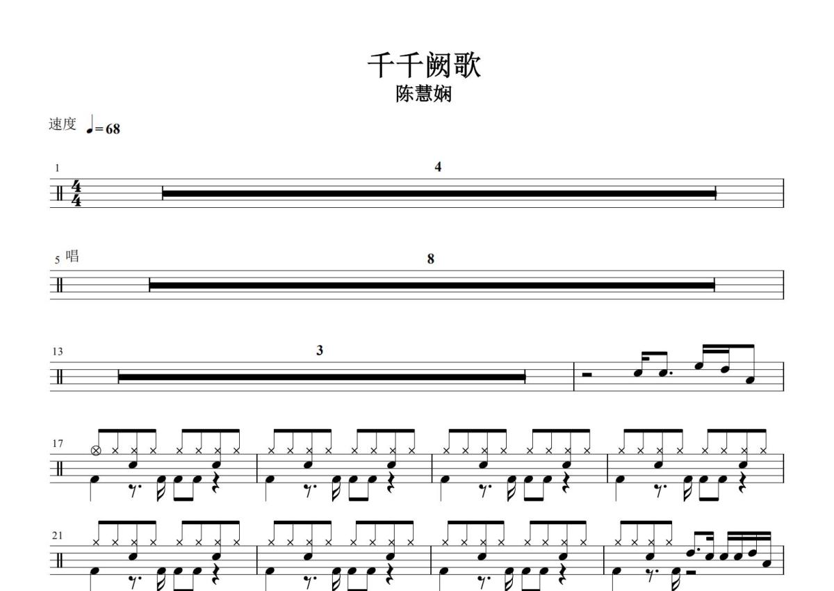 《千千阙歌》是陈慧娴演唱的一首歌曲,这份鼓谱共有两张高清图谱,图谱由 @打鼓谱 编配上传,图谱使用五线谱编配,使用这份千千阙歌架子鼓谱,你将能够轻松地敲打出这首陈慧娴的千千阙歌,快来尝试吧。《千千阙歌》是陈慧娴演唱的一首粤语歌曲,由林振强作词,马饲野康二作曲,卢东尼编曲,欧丁玉、陈永明、陈慧娴共同担任制作人,收录于1989年7月25日由环球唱片发行的专辑《永远是你的朋友》中 。 1989年,该曲获得年度无线电视十大劲歌金曲奖、第十二届香港电台十大中文金曲奖 。