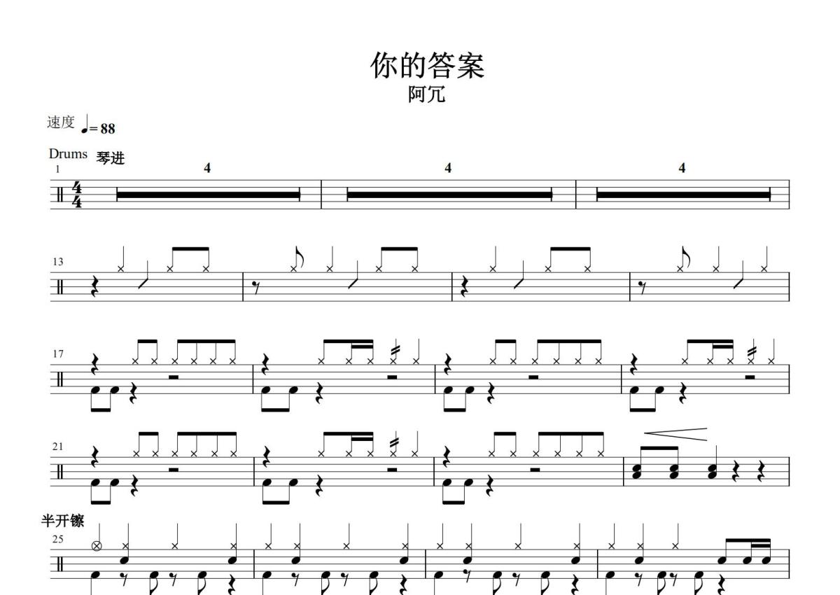 阿冗《你的答案》鼓谱 - 架子鼓谱