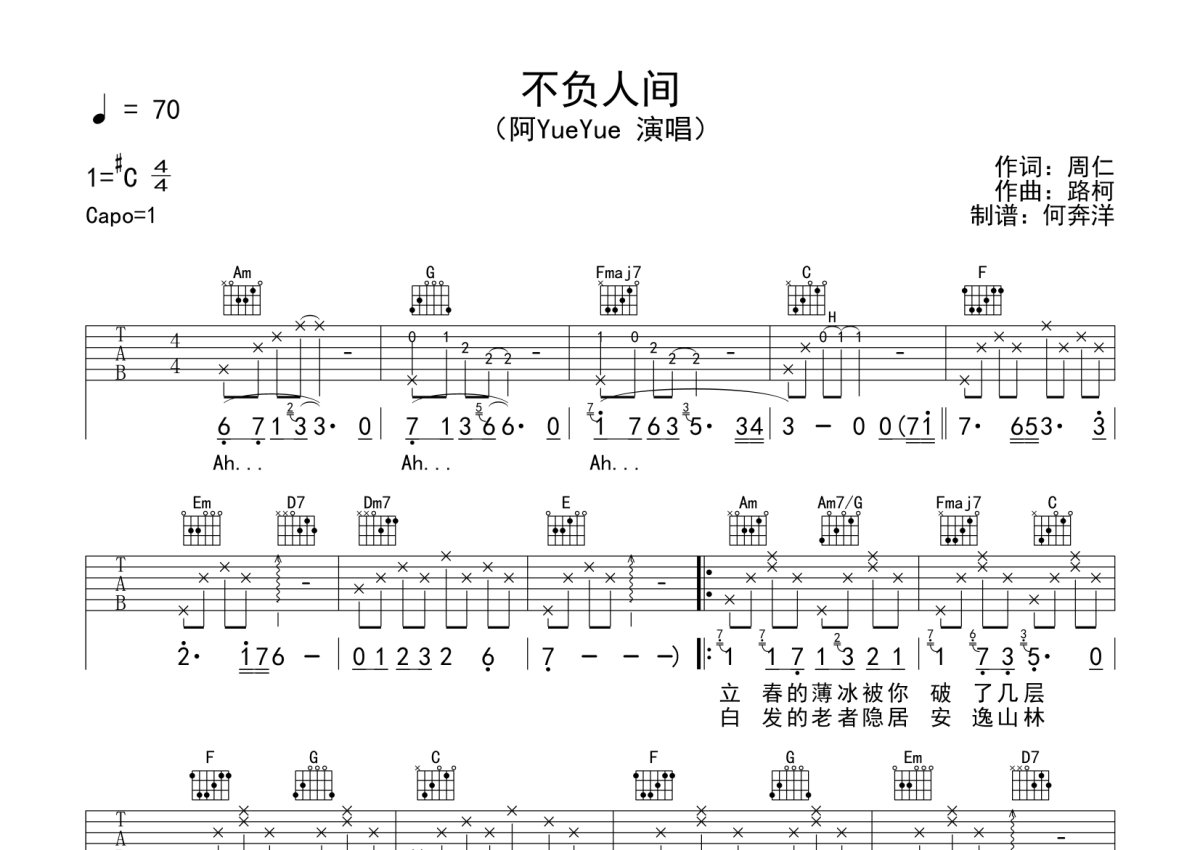 《不负人间》是阿YueYue演唱的一首歌曲,本吉他谱采用的是C调指法编配,这份吉他谱共有两张高清图谱,图谱由 @何奔洋 编配上传,图谱使用六线谱编配,包含吉他和弦指法、简谱以及歌词部分,使用这份不负人间吉他谱,可以让你更加方便地掌握这首歌曲的弹唱技巧,快来尝试吧。阿YueYue《不负人间》吉他谱_C调吉他弹唱谱。