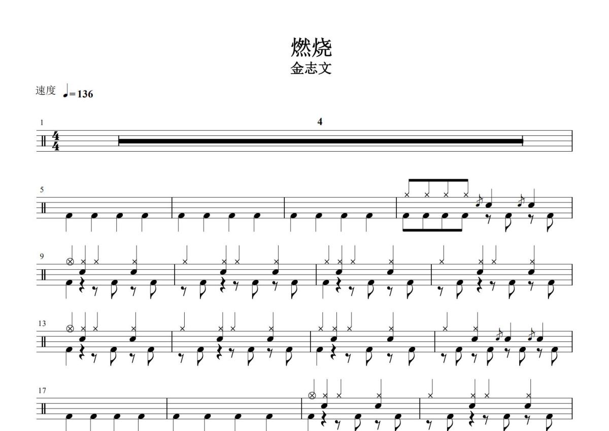 《燃烧》是金志文演唱的一首歌曲,这份鼓谱共有四张高清图谱,图谱由 @打鼓谱 编配上传,图谱使用五线谱编配,使用这份燃烧架子鼓谱,你将能够轻松地敲打出这首金志文的燃烧,快来尝试吧。金志文演唱的一首摇滚类歌曲。Rap为主。