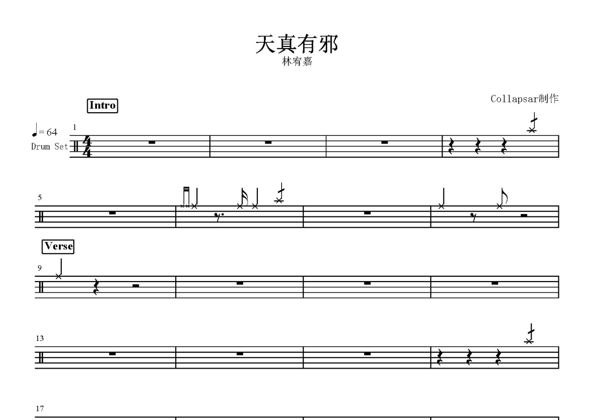 《天真有邪》是林宥嘉演唱的一首歌曲,这份鼓谱共有三张高清图谱,图谱由 @打鼓谱 编配上传,图谱使用五线谱编配,使用这份天真有邪架子鼓谱,你将能够轻松地敲打出这首林宥嘉的天真有邪,快来尝试吧。《天真有邪》是林宥嘉演唱的歌曲,由黄伟文填词、林宥嘉谱曲,收录于林宥嘉2016年6月17日发行的专辑《今日营业中》中。 。