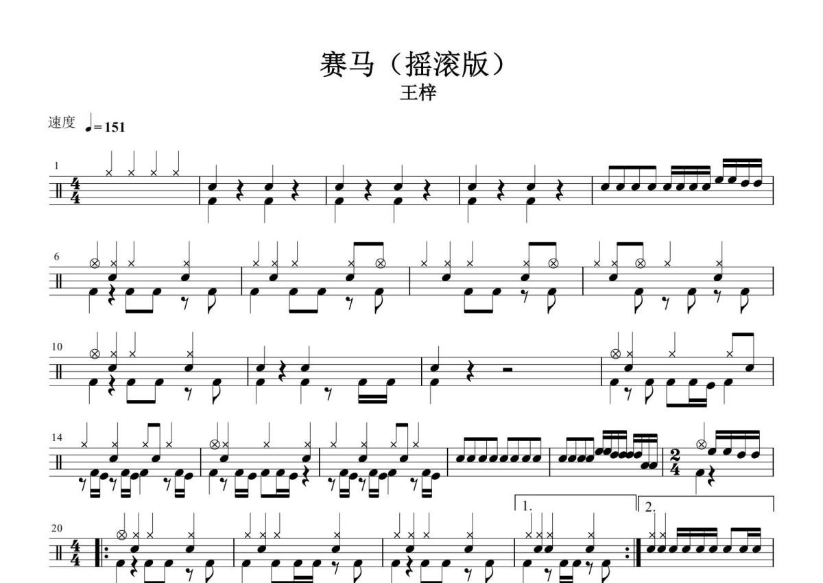王梓《赛马》鼓谱 - 架子鼓谱 - 摇滚版
