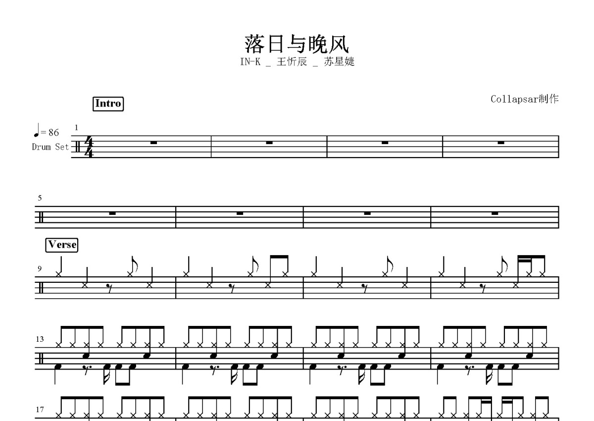 IN-K/王忻辰/苏星婕《落日与晚风》鼓谱 - 架子鼓谱