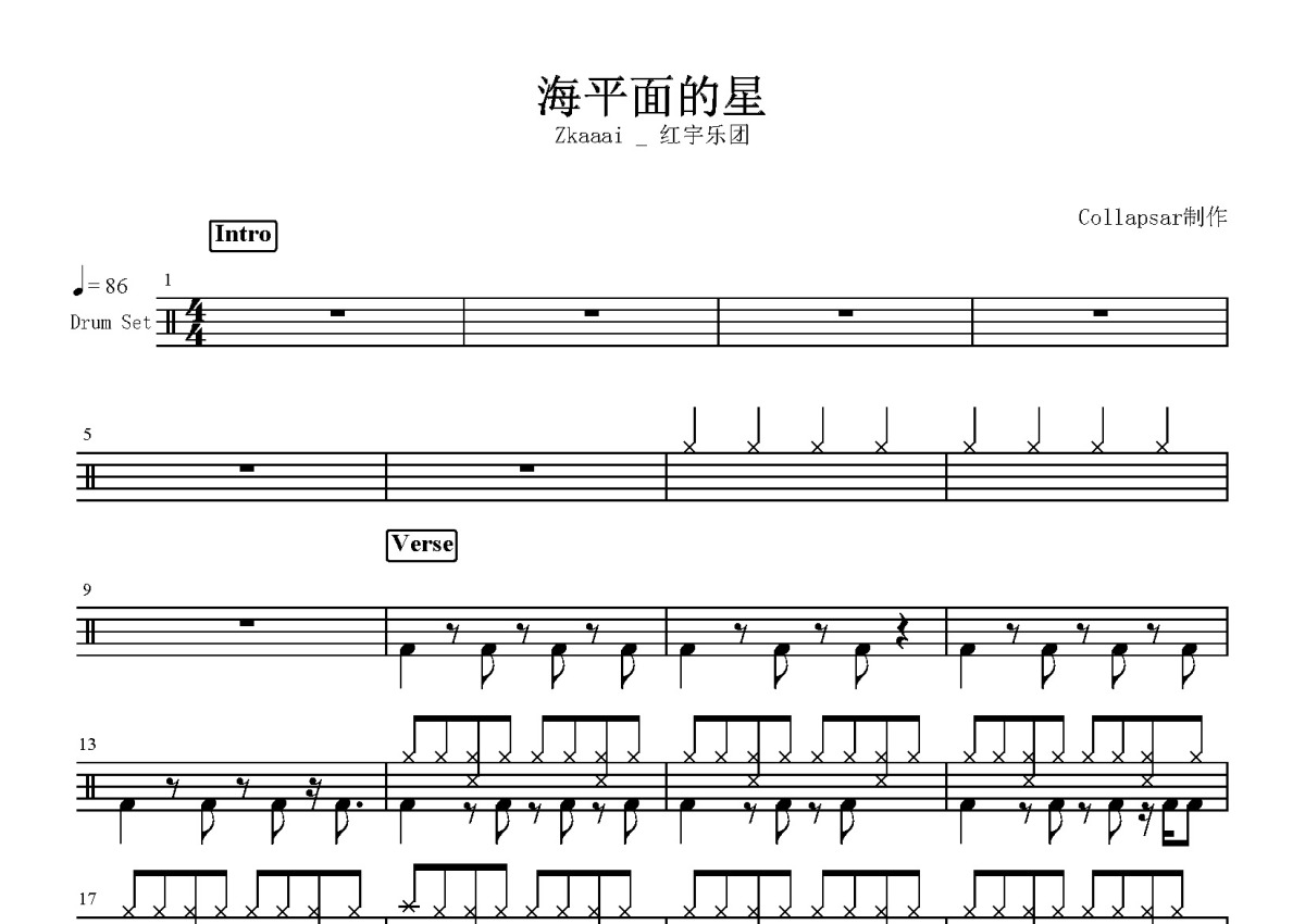 Zkaaai和红宇乐团《海平面的星》鼓谱 - 架子鼓谱