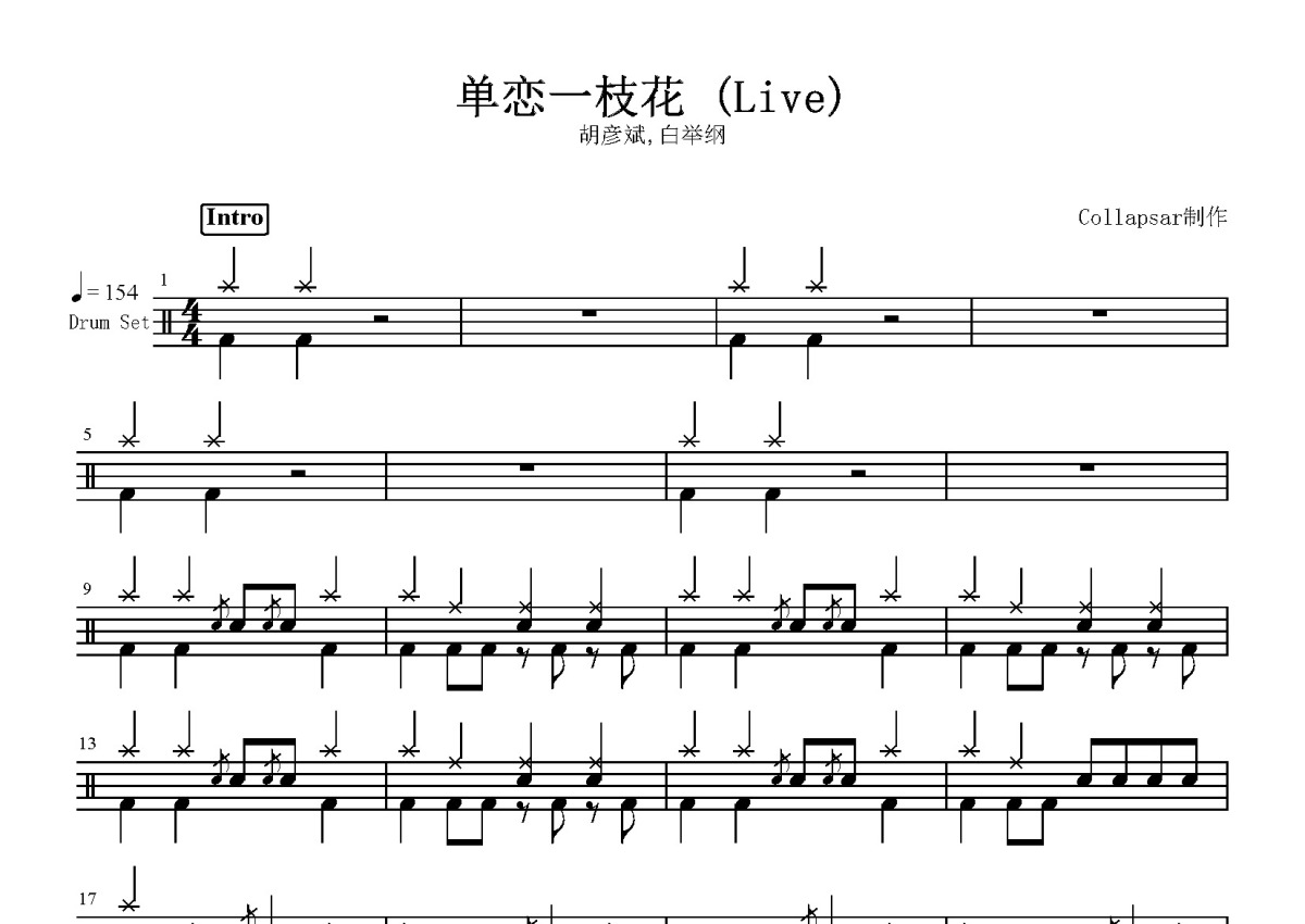 胡彦斌/白举纲《单恋一枝花》鼓谱 - 架子鼓谱