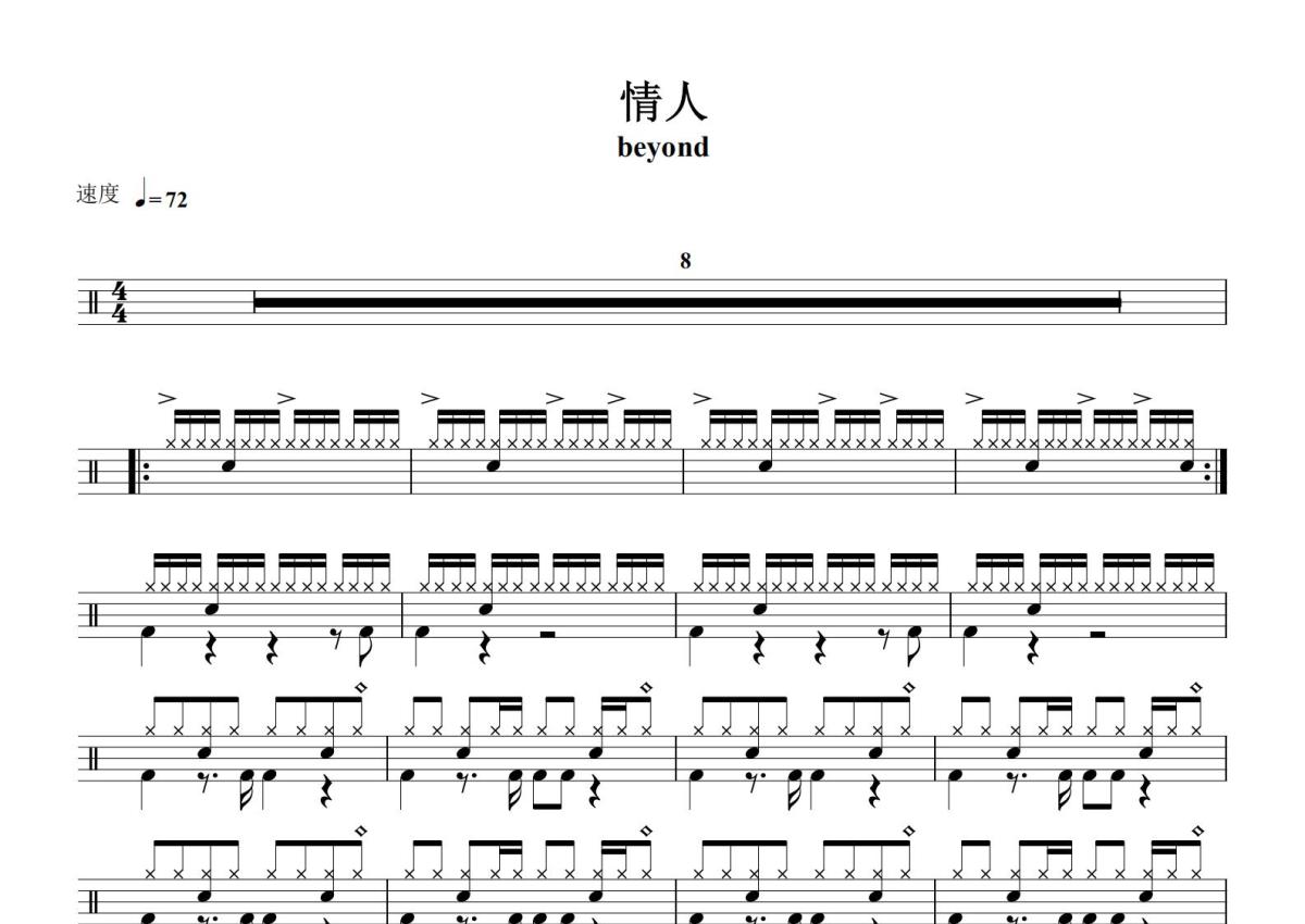 《情人》是Beyond演唱的一首歌曲,这份鼓谱共有两张高清图谱,图谱由 @打鼓谱 编配上传,图谱使用五线谱编配,使用这份情人架子鼓谱,你将能够轻松地敲打出这首Beyond的情人,快来尝试吧。《情人》是中国香港摇滚乐队Beyond的一首粤语歌曲,由黄家驹作曲,刘卓辉作词,Beyond、梁邦彦共同编曲,黄家驹演唱,收录在Beyond1993年5月14日发行的粤语专辑《乐与怒》中 。