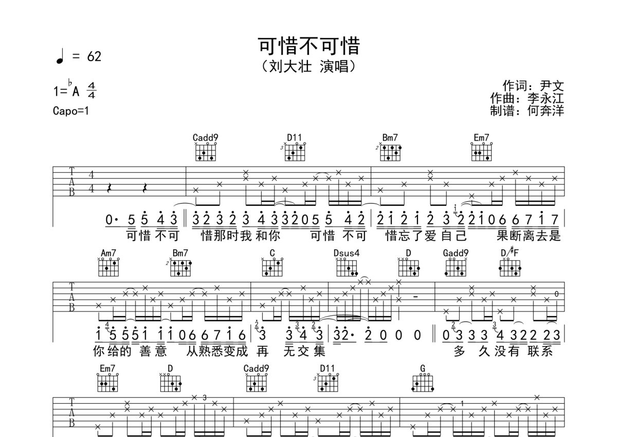 刘大壮《可惜不可惜》吉他谱 - G调弹唱六线谱