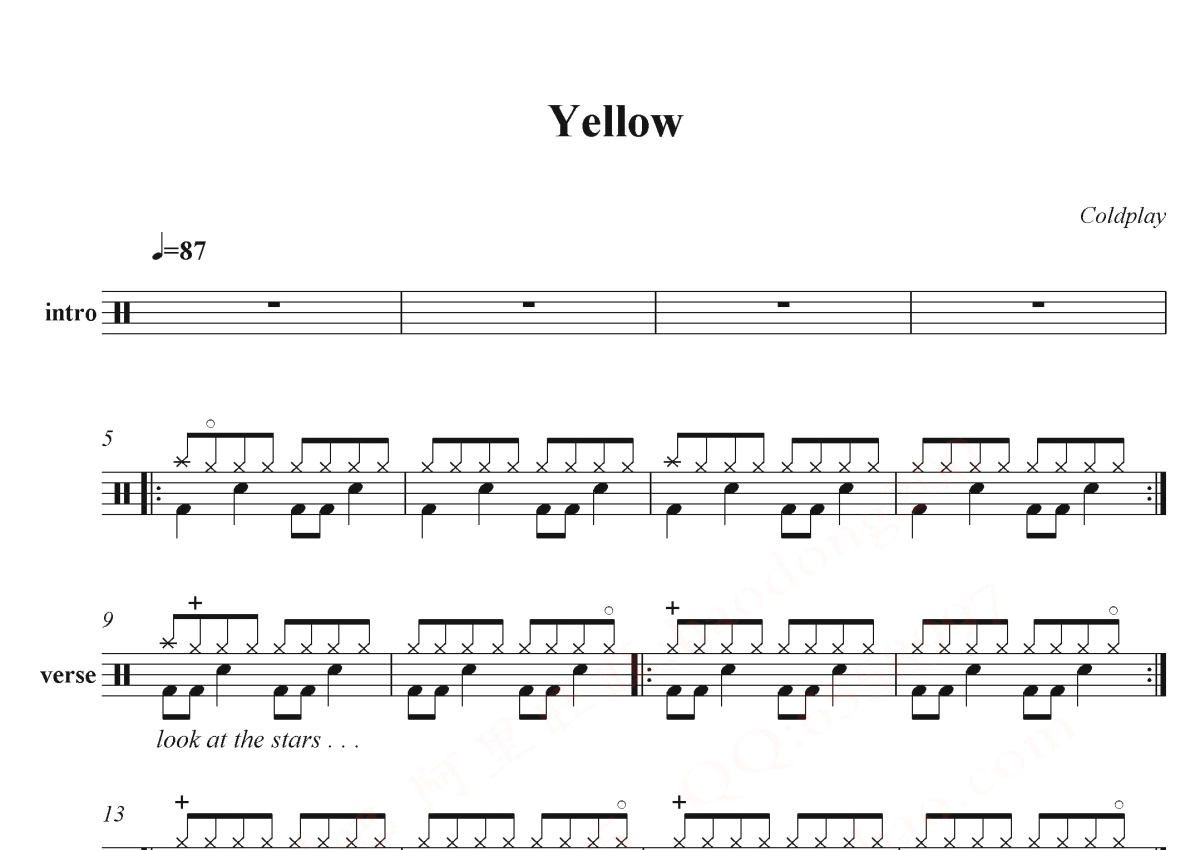 《Yellow》是酷玩乐队(Coldplay)演唱的一首歌曲,这份鼓谱共有两张高清图谱,图谱由 @打鼓谱 编配上传,图谱使用五线谱编配,使用这份Yellow架子鼓谱,你将能够轻松地敲打出这首酷玩乐队(Coldplay)的Yellow,快来尝试吧。《Yellow》是英国摇滚乐队酷玩乐队演唱的歌曲,由乐队四位成员克里斯·马汀、盖·贝瑞曼、强尼·邦蓝、威尔·查平共同填词,肯·尼尔森和乐队四位成员共同制作。这首歌被收录于乐队的首张专辑《Parachutes》里,并于2000年6月26日作为专辑的第二支单曲发布。 酷玩乐队(Coldplay),英国摇滚乐队,1996年成立于伦敦,由主唱克里斯·马汀、贝斯手盖伊·贝瑞曼、吉他手强尼·邦蓝以及鼓手威尔·查平组成。创意总监及前经纪人菲尔·哈维通常被视作乐队的第五个成员。