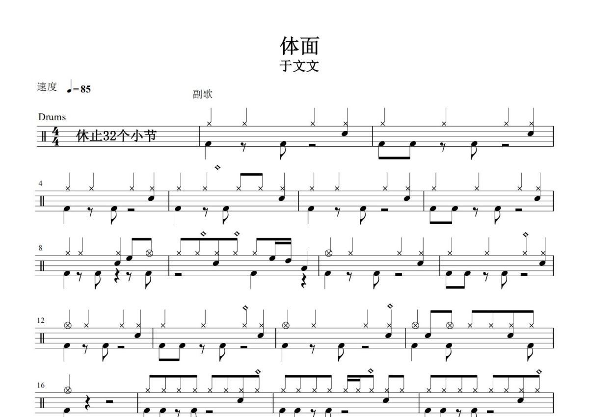《体面》是于文文演唱的一首歌曲,这份鼓谱共有两张高清图谱,图谱由 @打鼓谱 编配上传,图谱使用五线谱编配,使用这份体面架子鼓谱,你将能够轻松地敲打出这首于文文的体面,快来尝试吧。《体面》是电影《前任3:再见前任》的插曲,由唐恬作词,郑楠编曲,于文文作曲并演唱,单曲于2017年12月25日发行 。后收录在于文文于2018年11月7日发行的专辑《尚未界定Undefined》中。