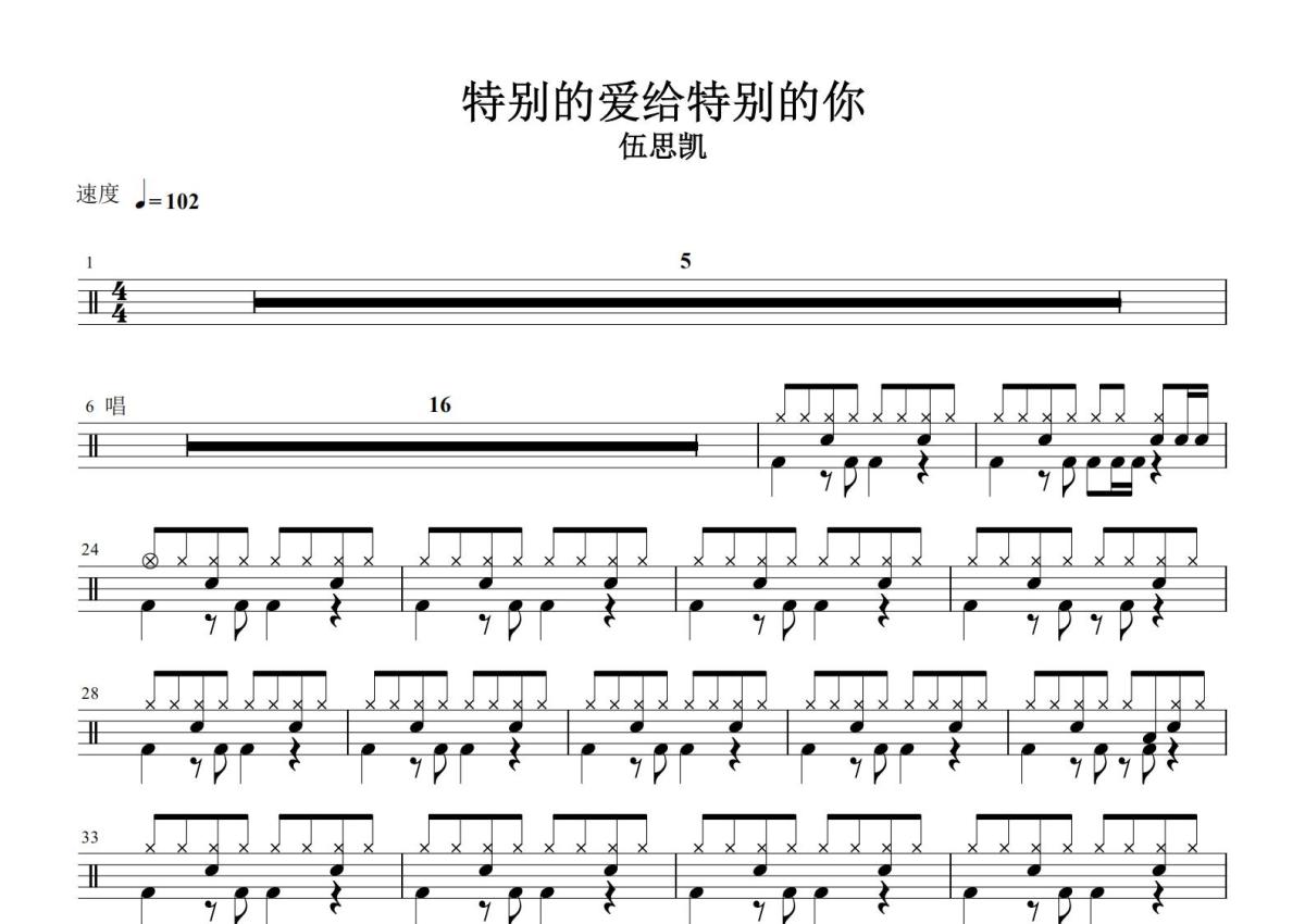 《特别的爱给特别的你》是伍思凯演唱的一首歌曲,这份鼓谱共有三张高清图谱,图谱由 @打鼓谱 编配上传,图谱使用五线谱编配,使用这份特别的爱给特别的你架子鼓谱,你将能够轻松地敲打出这首伍思凯的特别的爱给特别的你,快来尝试吧。《特别的爱给特别的你》是伍思凯演唱的一首歌曲,由陈家丽作词,伍思凯作曲、编曲、制作,这首歌曲收录在伍思凯1990年7月6日发行的同名专辑《特别的爱给特别的你》中。