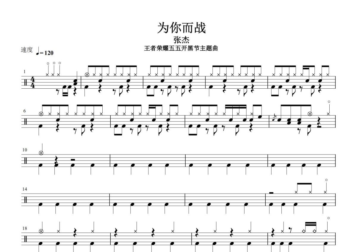 《为你而战》是张杰演唱的一首歌曲,这份鼓谱共有三张高清图谱,图谱由 @打鼓谱 编配上传,图谱使用五线谱编配,使用这份为你而战架子鼓谱,你将能够轻松地敲打出这首张杰的为你而战,快来尝试吧。《为你而战》是由张杰演唱的王者荣耀五五开黑节主题曲,由甘世佳、张杰作词,金东炫、陈民澔、李钟浩作曲,发行于2020年5月4日。