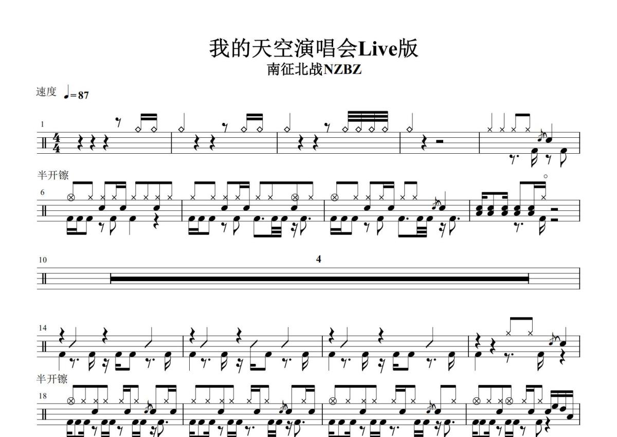 《我的天空》是南征北战NZBZ演唱的一首歌曲,这份鼓谱共有三张高清图谱,图谱由 @打鼓谱 编配上传,图谱使用五线谱编配,使用这份我的天空架子鼓谱,你将能够轻松地敲打出这首南征北战NZBZ的我的天空,快来尝试吧。《我的天空》是南征北战NZBZ为电影《青春派》 创作的主题曲和片尾曲,由南征北战NZBZ作词、作曲并演唱,后收录于南征北战NZBZ2016年5月25日发行的专辑《6415》中,该歌曲蝉联QQ音乐、酷狗音乐、酷我音乐、网易云音乐等各大音乐平台热歌榜近24个月,获一致好评。