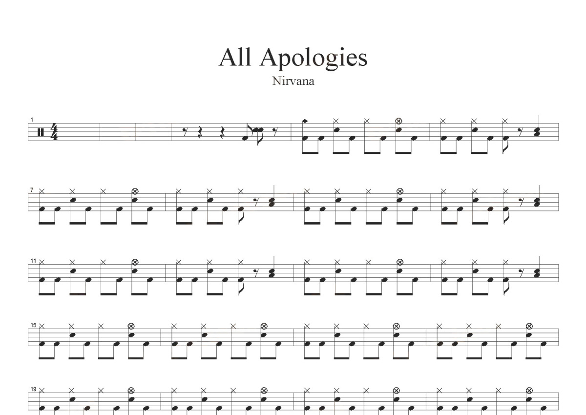 《All Apologies》是Nirvana演唱的一首歌曲,这份鼓谱共有三张高清图谱,图谱由 @打鼓谱 编配上传,图谱使用五线谱编配,使用这份All Apologies架子鼓谱,你将能够轻松地敲打出这首Nirvana的All Apologies,快来尝试吧。《All Apologies》是由Nirvana演唱的一首歌曲,收录在专辑《Sliver - The Best Of The Box》中。Nirvana(涅槃乐队),美国摇滚乐队,由主唱兼吉他手科特·柯本、贝斯手克里斯特·诺沃塞利克、鼓手大卫·格鲁组成。