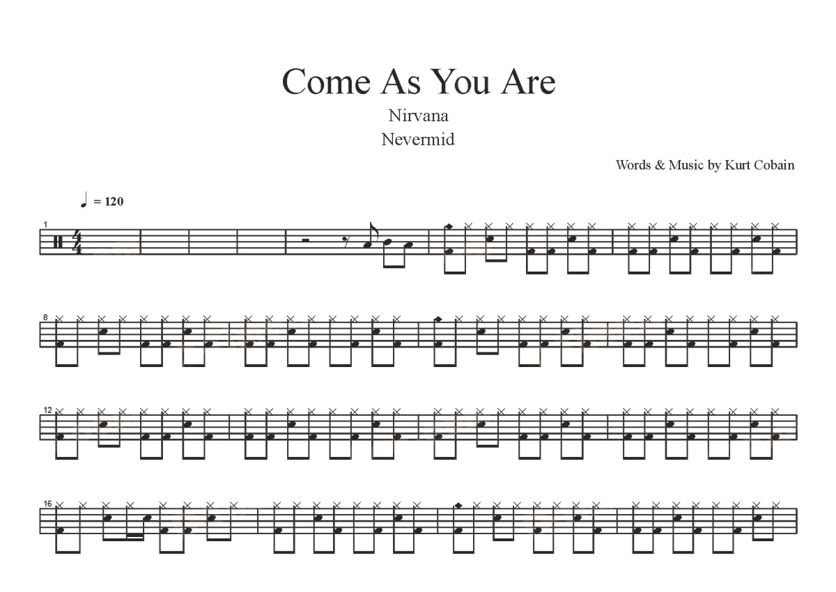 《Come As You Are》是Nirvana演唱的一首歌曲,这份鼓谱共有三张高清图谱,图谱由 @打鼓谱 编配上传,图谱使用五线谱编配,使用这份Come As You Are架子鼓谱,你将能够轻松地敲打出这首Nirvana的Come As You Are,快来尝试吧。《Come As You Are》涅槃乐队歌曲,收录于专辑《Nevermind》,歌曲中反复吟唱着No I don’t have a gun(不,我没有枪) 与memoria(记忆 西语)Nirvana(涅槃乐队),美国摇滚乐队,由主唱兼吉他手科特·柯本、贝斯手克里斯特·诺沃塞利克、鼓手大卫·格鲁组成。