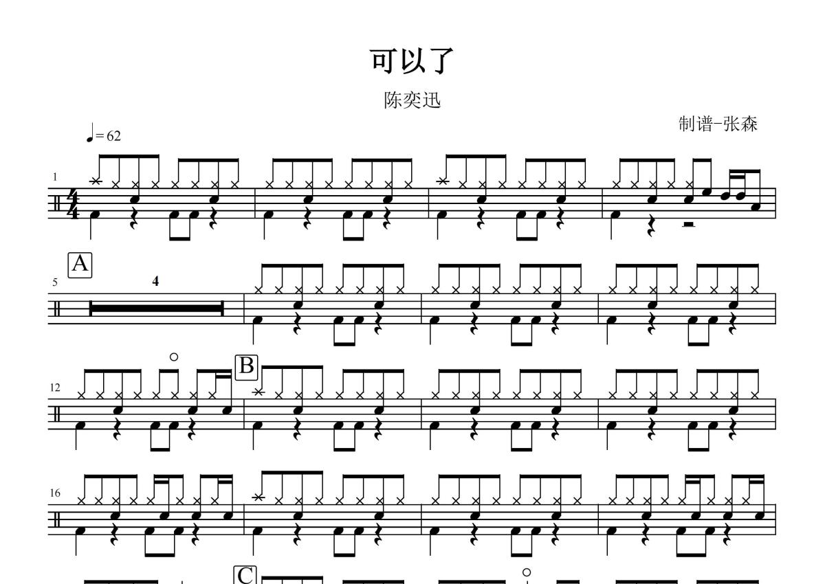 《可以了》是陈奕迅演唱的一首歌曲,这份鼓谱共有两张高清图谱,图谱由 @打鼓谱 编配上传,图谱使用五线谱编配,使用这份可以了架子鼓谱,你将能够轻松地敲打出这首陈奕迅的可以了,快来尝试吧。《可以了》是中国香港流行男歌手陈奕迅演唱的一首歌曲,由林怡凤作词,林俊杰作曲,Martin Tang编曲。收录于专辑《米·闪》中,发行于2014年5月15日。