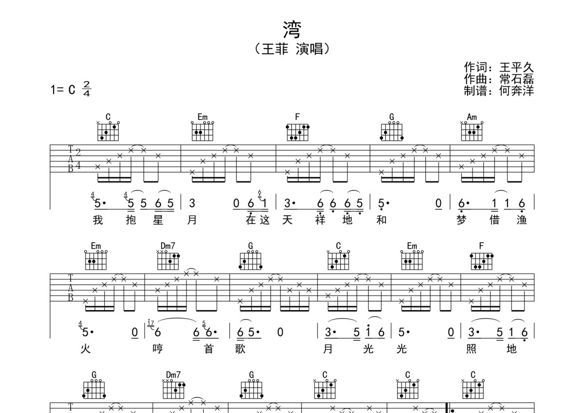 王菲《湾》吉他谱 - C调弹唱六线谱
