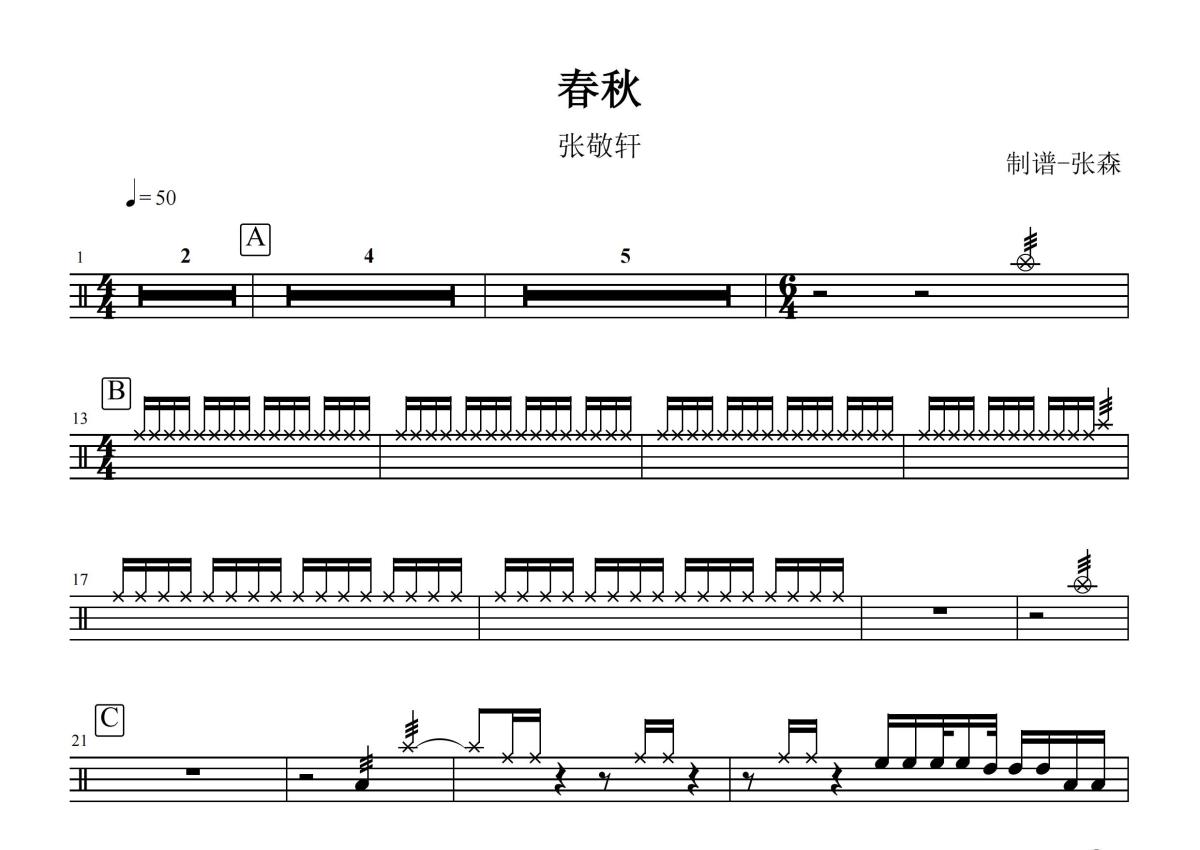 《春秋》是张敬轩演唱的一首歌曲,这份鼓谱共有两张高清图谱,图谱由 @打鼓谱 编配上传,图谱使用五线谱编配,使用这份春秋架子鼓谱,你将能够轻松地敲打出这首张敬轩的春秋,快来尝试吧。《春秋》是张敬轩演唱的歌曲,收录于第十一张个人专辑《No. Eleven》中,为该专辑主打歌曲之一,2010年4月16日发行。