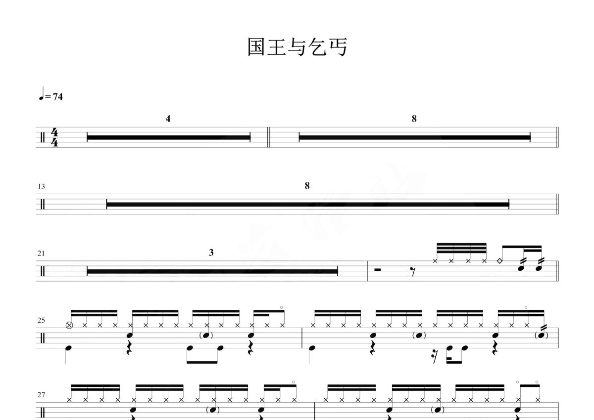 《国王与乞丐》是华晨宇&杨宗纬演唱的一首歌曲,这份鼓谱共有两张高清图谱,图谱由 @打鼓谱 编配上传,图谱使用五线谱编配,使用这份国王与乞丐架子鼓谱,你将能够轻松地敲打出这首华晨宇&杨宗纬的国王与乞丐,快来尝试吧。《国王与乞丐》是华晨宇第二张专辑《异类》里与杨宗纬合唱的一首歌。歌曲由马来西亚联合作曲人Mike Chan & Faizal Tahir作曲,代岳东填词,郑楠担任制作人。于2015年6月26日首发。8月7日,歌曲MV正式发布。华晨宇,1990年2月7日生于湖北省十堰市,中国内地流行乐男歌手、作曲人,毕业于武汉音乐学院。杨宗纬(Aska Yang),1978年4月4日生于中国台湾桃园市,中国台湾流行乐男歌手。