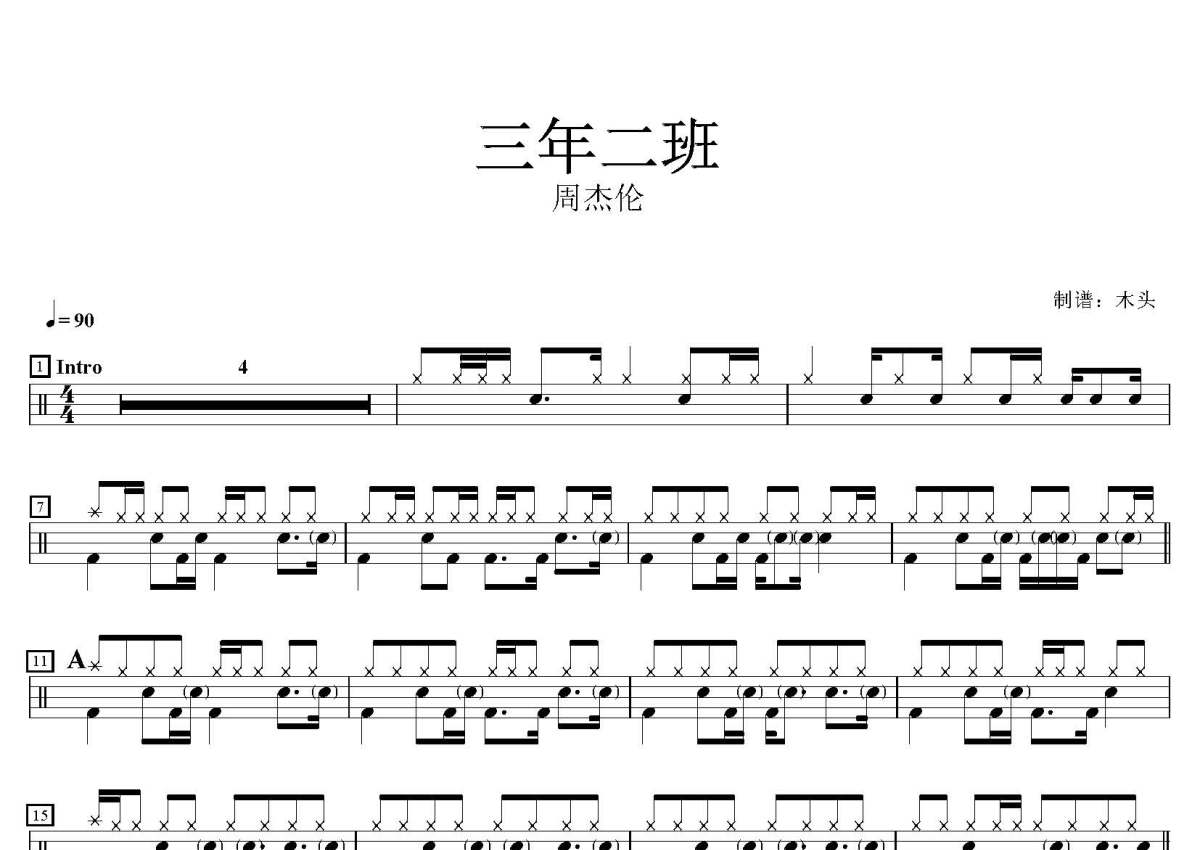 周杰伦《三年二班》鼓谱 - 架子鼓谱