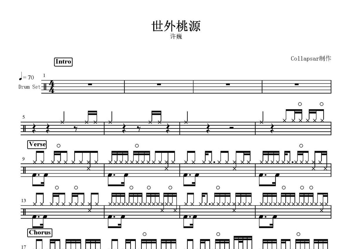 《世外桃源》是许巍演唱的一首歌曲,这份鼓谱共有两张高清图谱,图谱由 @打鼓谱 编配上传,图谱使用五线谱编配,使用这份世外桃源架子鼓谱,你将能够轻松地敲打出这首许巍的世外桃源,快来尝试吧。《世外桃源》是许巍作词作曲并演唱的一首歌曲,该曲收录在许巍2012年发行的专辑《此时此刻》中。
