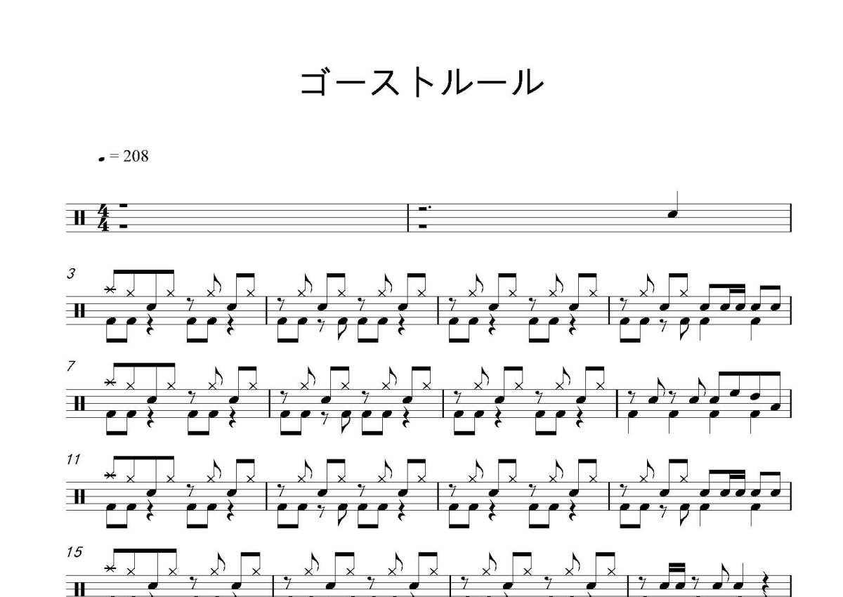 《ゴーストルール》,这份鼓谱共有一张高清图谱,图谱由 @打鼓谱 编配上传,图谱使用五线谱编配,使用这份ゴーストルール架子鼓谱,你将能够轻松地敲打出这首ゴーストルール,快来尝试吧。《ゴーストルール》现场版。