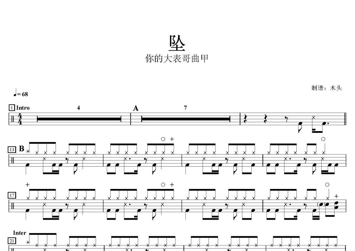 《坠》是你的大表哥曲甲演唱的一首歌曲,这份鼓谱共有两张高清图谱,图谱由 @打鼓谱 编配上传,图谱使用五线谱编配,使用这份坠架子鼓谱,你将能够轻松地敲打出这首你的大表哥曲甲的坠,快来尝试吧。歌曲名:坠,歌手名:你的大表哥曲甲,专辑名:坠。