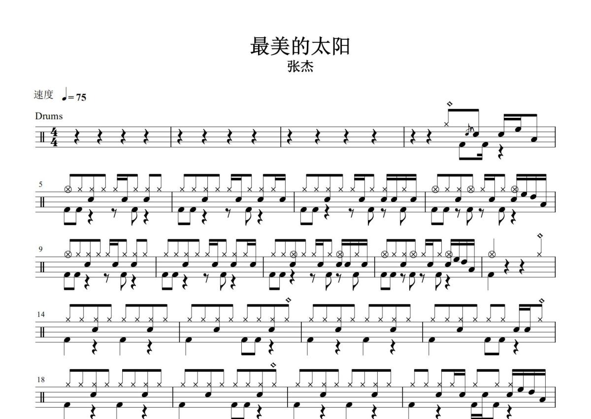 《最美的太阳》是张杰演唱的一首歌曲,这份鼓谱共有两张高清图谱,图谱由 @打鼓谱 编配上传,图谱使用五线谱编配,使用这份最美的太阳架子鼓谱,你将能够轻松地敲打出这首张杰的最美的太阳,快来尝试吧。《最美的太阳》是张杰演唱的一首歌曲,由刘吉宁作词作曲、周治平编曲,收录在张杰2007年发行的《最美的太阳》同名EP和2012年发行的《One Chance 张杰新歌+精选》专辑里。2007年12月4日中歌榜首播 。 2008年该歌曲获得中国歌曲排行榜第一季度金曲 。