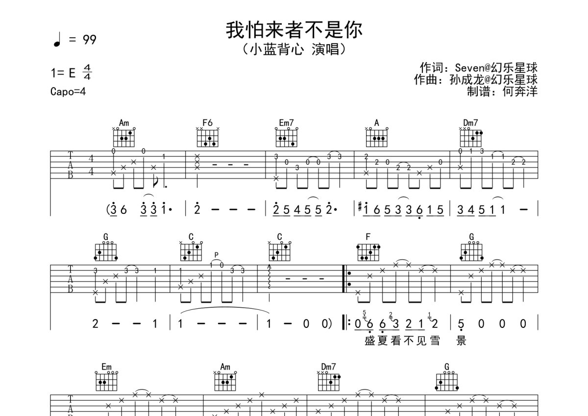 《我怕来者不是你》是小蓝背心演唱的一首歌曲,本吉他谱采用的是C调指法编配,这份吉他谱共有两张高清图谱,图谱由 @何奔洋 编配上传,图谱使用六线谱编配,包含吉他和弦指法、简谱以及歌词部分,使用这份我怕来者不是你吉他谱,可以让你更加方便地掌握这首歌曲的弹唱技巧,快来尝试吧。小蓝背心《我怕来者不是你》吉他谱_C调吉他弹唱谱。